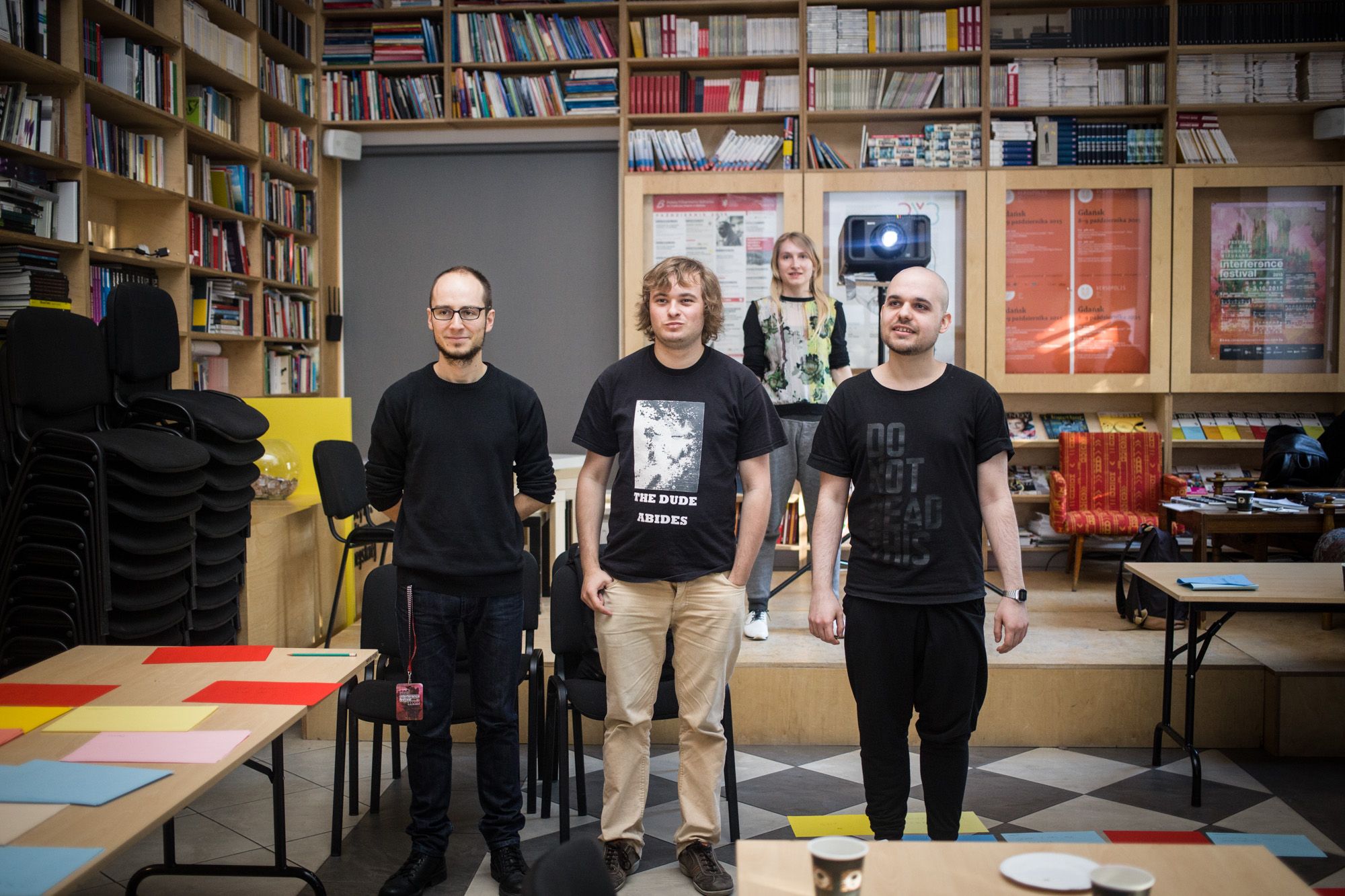 Interfejsy komunikacji: ludzie, programy, maszyny [Communication Interfaces: People, Programs, Machines] was a workshop conducted by Grupa ETC [The ETC Group] (Mateusz Felczak, Antoni Michnik, Maciej Ratajski) as a part of Interference Festival in Gdańsk. It was focused on the coding of information, starting from performative activities towards interaction with computer systems.
