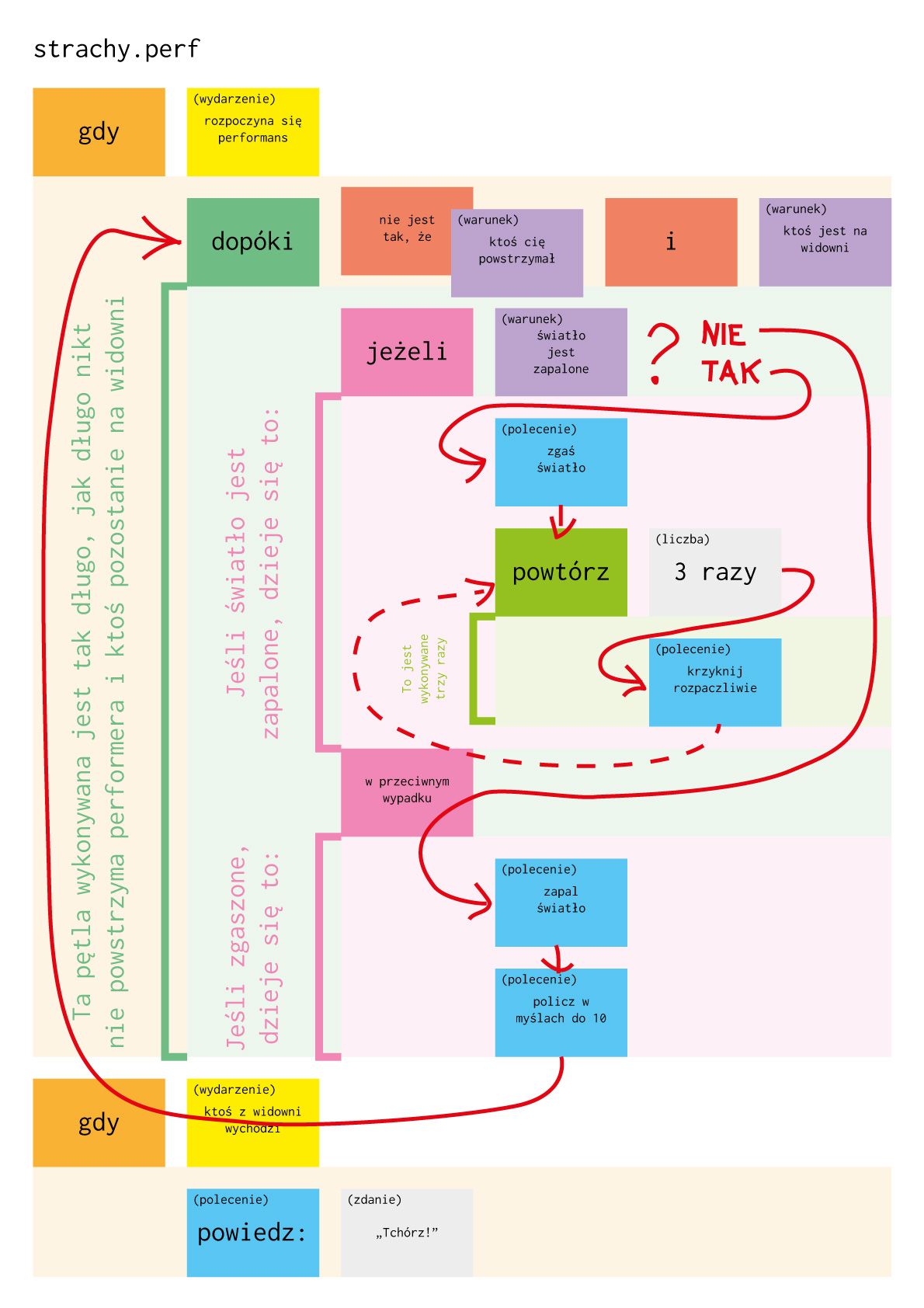 In the final part, the participants could use all of these strategies and with the aid of a simple programming language create their own procedural and interactive performance scores. For the final performance, they took full control of the Grupa ETC [The ETC Group] members, who performed for them the pieces created during the workshops.