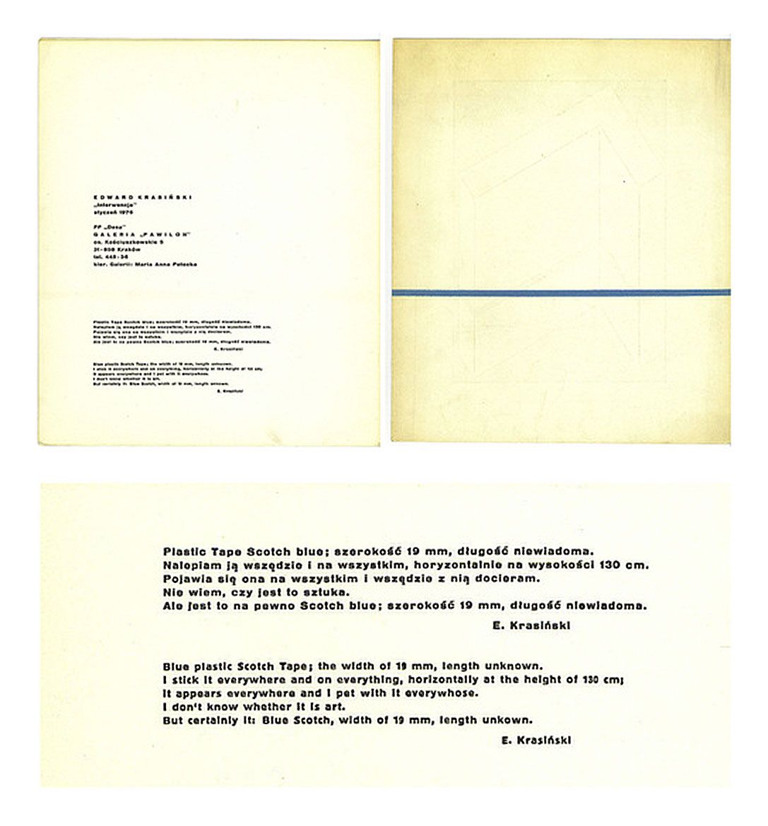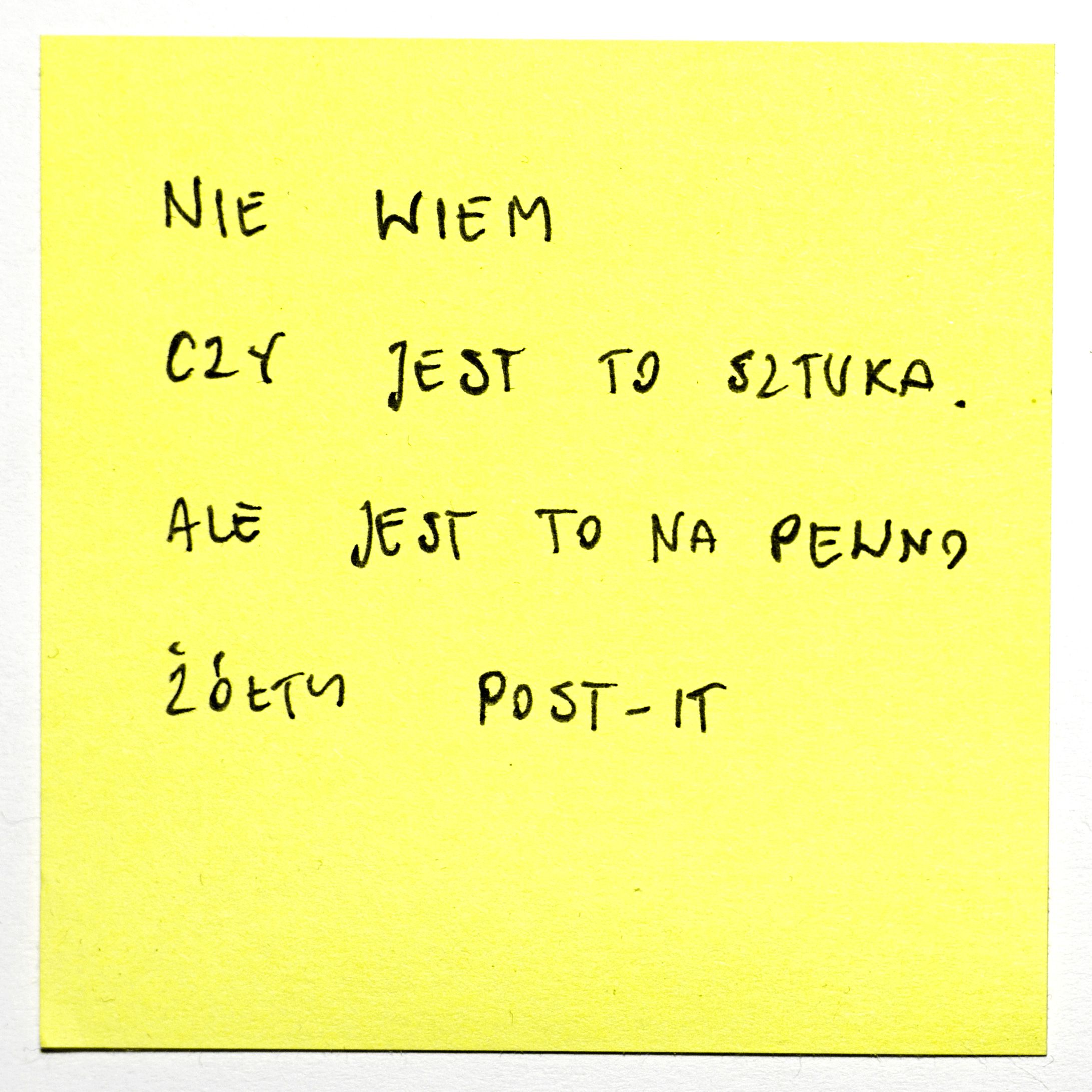 I don't know whether it is art. But certainly it is a Post-it note. [Homage a Edward Krasiński] (2015) is a tribute to the Polish avant-garde artist Edward Krasiński (1925–2004). He became known for his use of Scotch Blue tape in his actions, sculptures and photo-based works from 1968 onwards. Krasiński pasted the 19 mm wide blue line around objects, paintings, trees, walls, gallery windows, etc. Always running at a height of 130 cm.