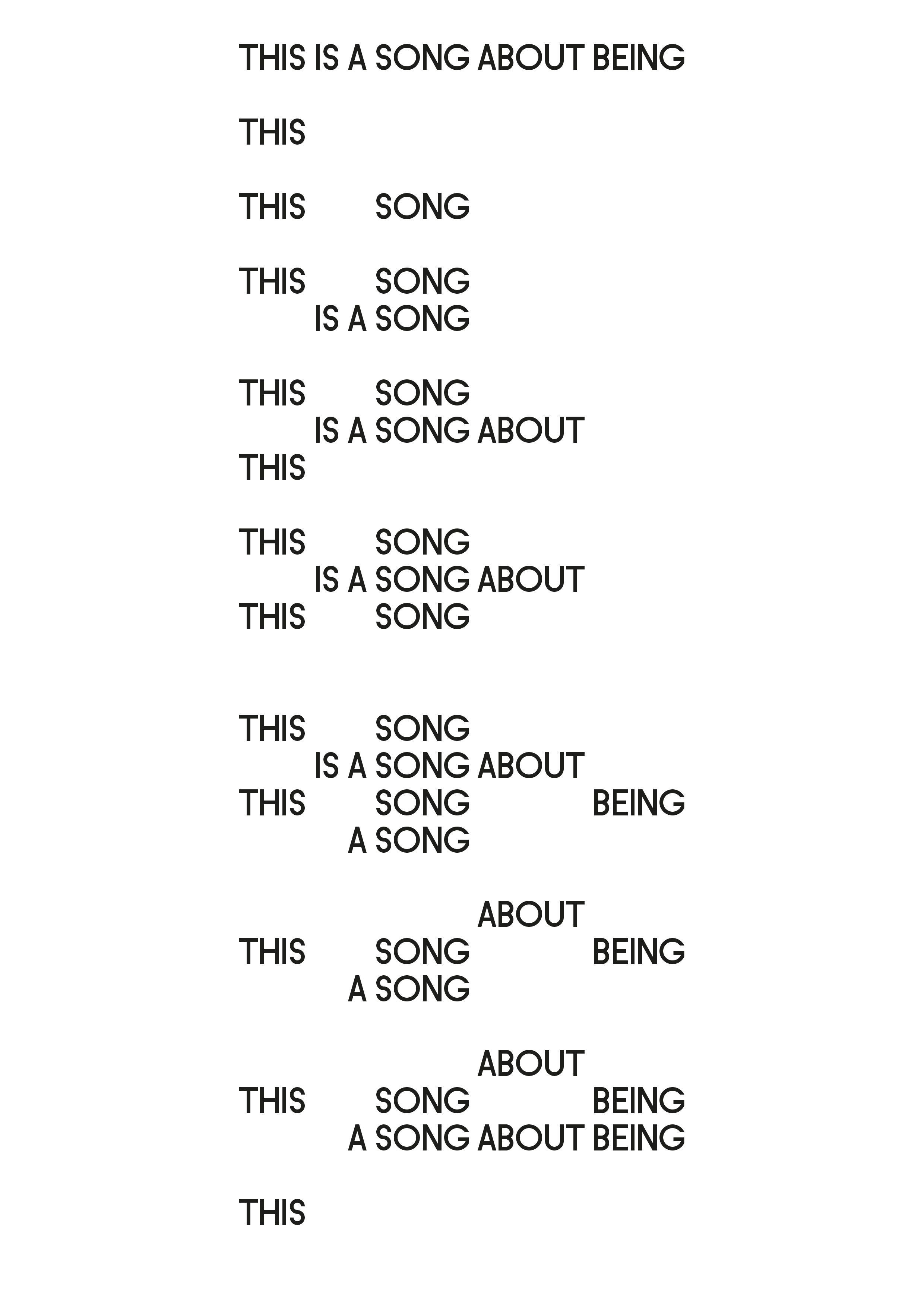 This Is A Song About Being performed by Maciej Ratajski and Agnieszka Szostakiewicz was exhibited at Fala dźwięku #33 + Grupa ETC event hosted by Trzecia Fala in Pogłos in Warsaw. Looped video with sound on LCD TV was placed in a club toilet.