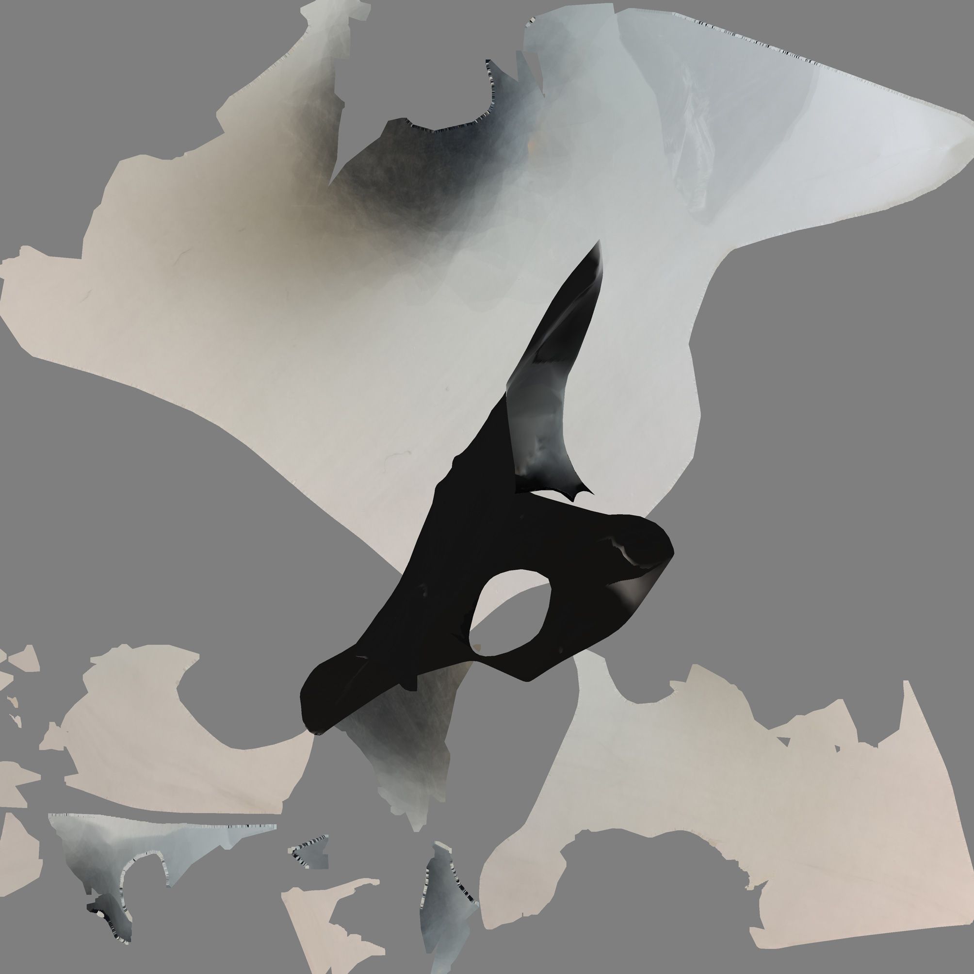 Print uses a bitmap texture created by 3d-scanning a piece of black obsidian rock lying on a white background. The scanning glitch led to the creation of a 3d model that treated the stone's shadow as a three-dimensional object and the stone itself as a dark hole inside of it.